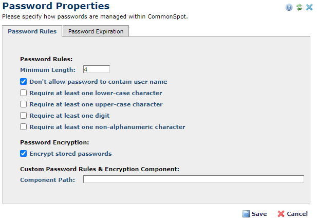 This dialog presents the following options which control the rules that CommonSpot enforces when a user's password is changed. This also controls how this password is stored in the CommonSpot database, and where any customizations are located. Note that this does not apply for sites where SAML (or some other custom) authentication has been configured.