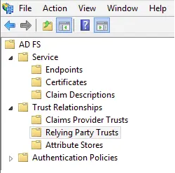 Open the 'AD FS Management' application from the 'Administrative Tools' section of the control panel. Select the 'Relying Party Trusts' option in the left-hand column.