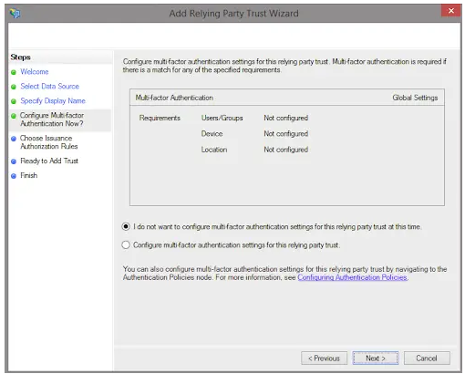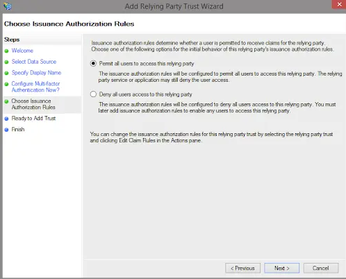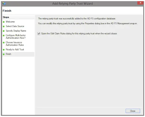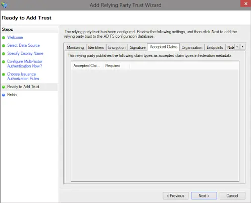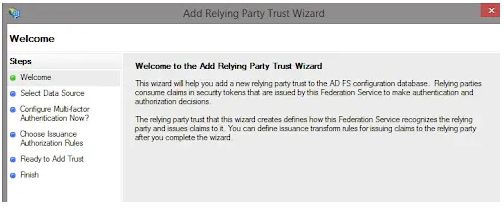 The following outlines a simple ADFS configuration using default options. This assumes that the ADFS server is fully configured and ready for establishment of relying party trusts.