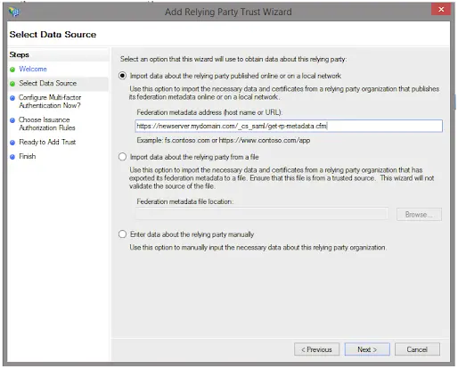 Enter the URL provided by the identity provider's administrator to get the Identity Provider's metadata, then click the 'Get Metadata..' button to download the metadata. For ADFS servers, this can be just the URL of the Identity Provider.