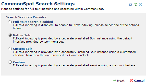 Native Solr: Recommended. Choose this option to implement the CommonSpot Solr implementation. You can optionally extend this implementation through the Search Engine API. See the CommonSpot Developer's Guide for details. Click Next to complete Native Solr configuration.