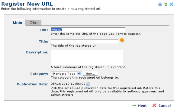 The Register New URL dialog is the next step in registering new external links. Click Registered URL from the New menu, select a subsite location for this URL, then click Next. This dialog displays for defining URL properties.