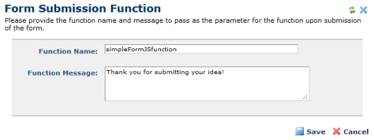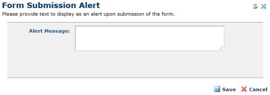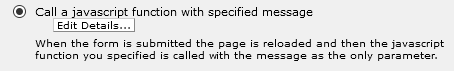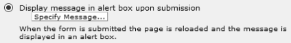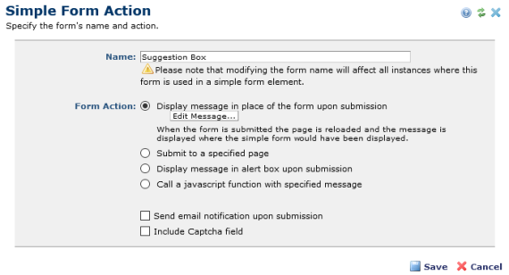 This dialog displays as the next option when you are first configuring a Simple Form or when you select Form Action from the Simple Form Element menu for an existing Simple Form. Use this to view or change what happens on form submit. There are 4 options, 3 of which involve displaying a message to the user submitting the form.